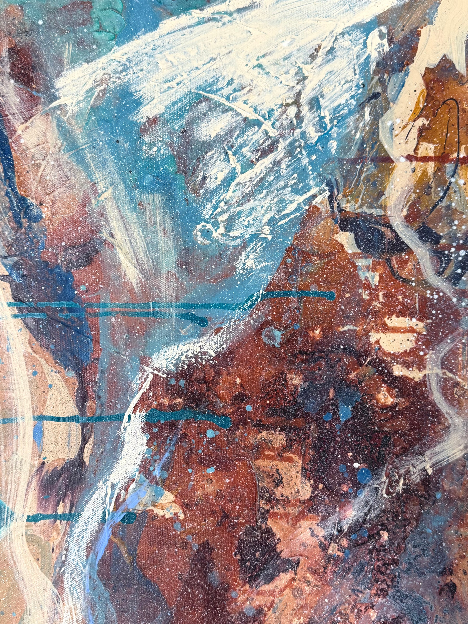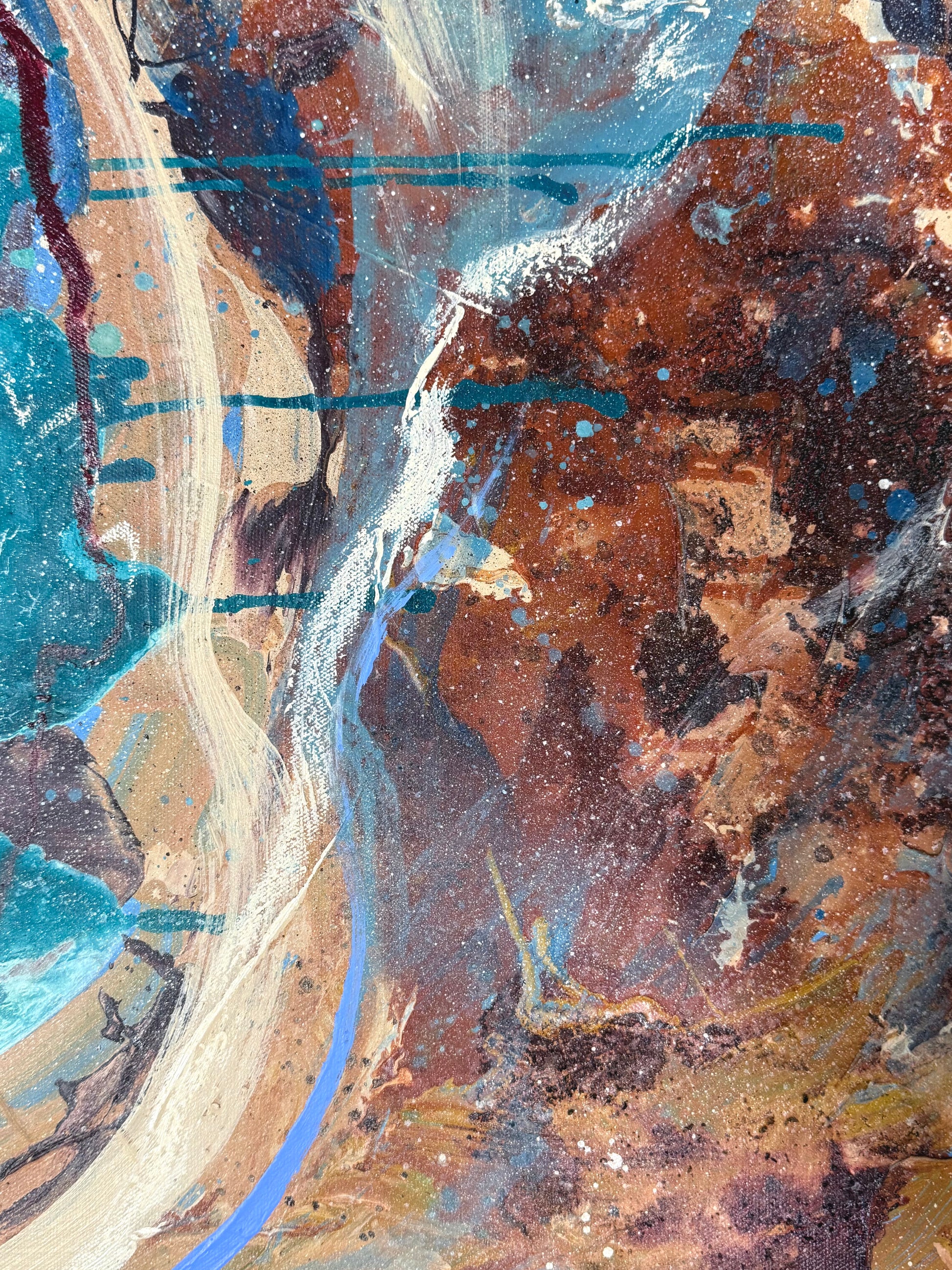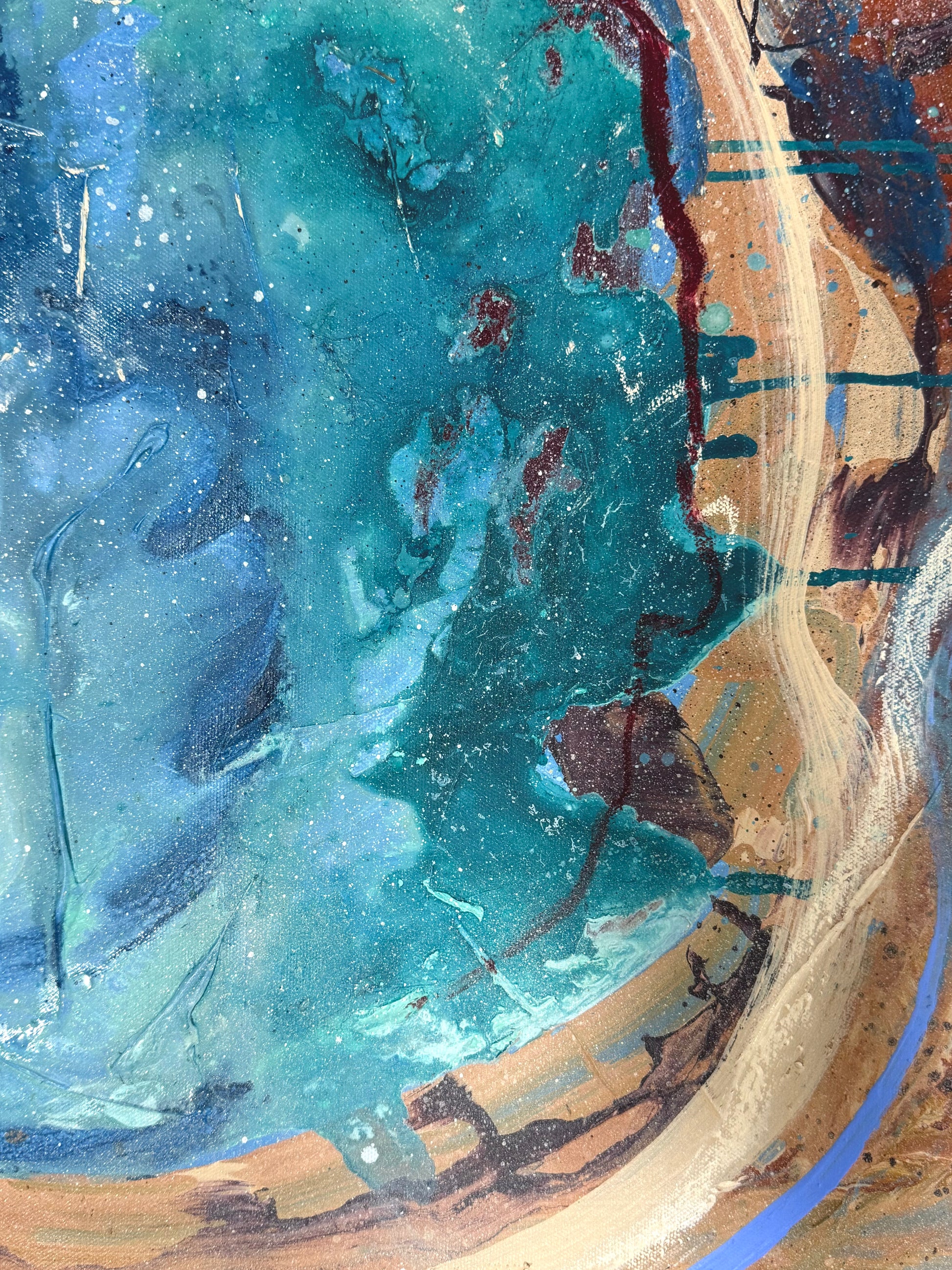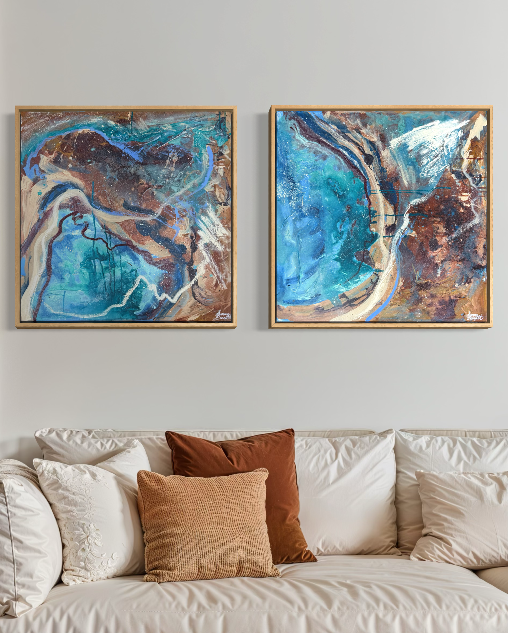 “Core I” perfectly pairs with "Core II" to create a striking display of our Aussie landscape. Red cliffs and turquoise oceans. Mixed media 610x610 framed in Eucalyptus Grandis.